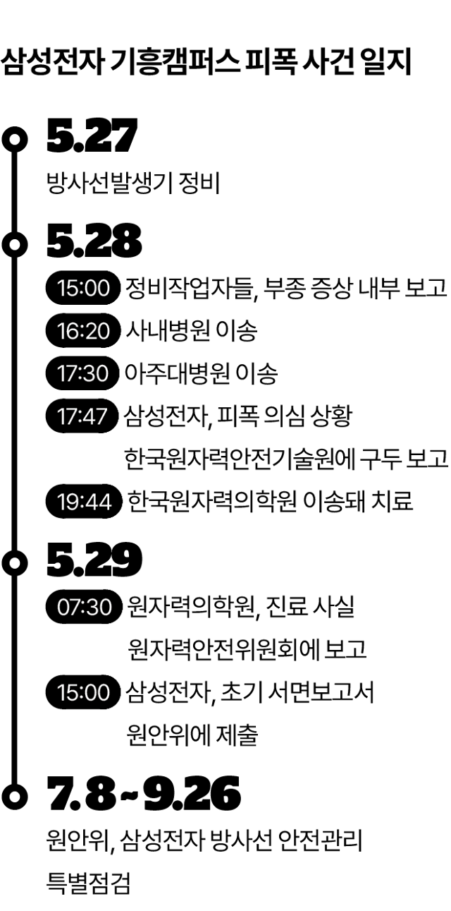 지난 5월 삼성전자 기흥사업장에서 노동자 2명이 기준치의 최대 188배를 초과(원자력안전위원회 추정치)한 방사선 피폭 사고를 당한 가운데, 회사의 초기 대응이 부실했다는 피해 노동자의 증언